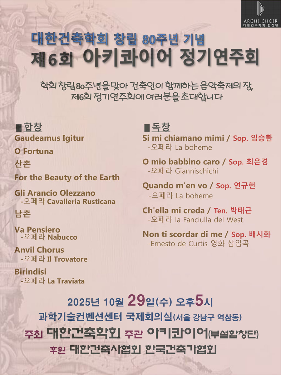 대한건축학회에서는 오는 10월 29일(수) 창립80주년을 맞아 건축인이 함께하는 음악축제의 장, 아키콰이어(부설합창단) 제6회 정기연주회를 개최합니다.